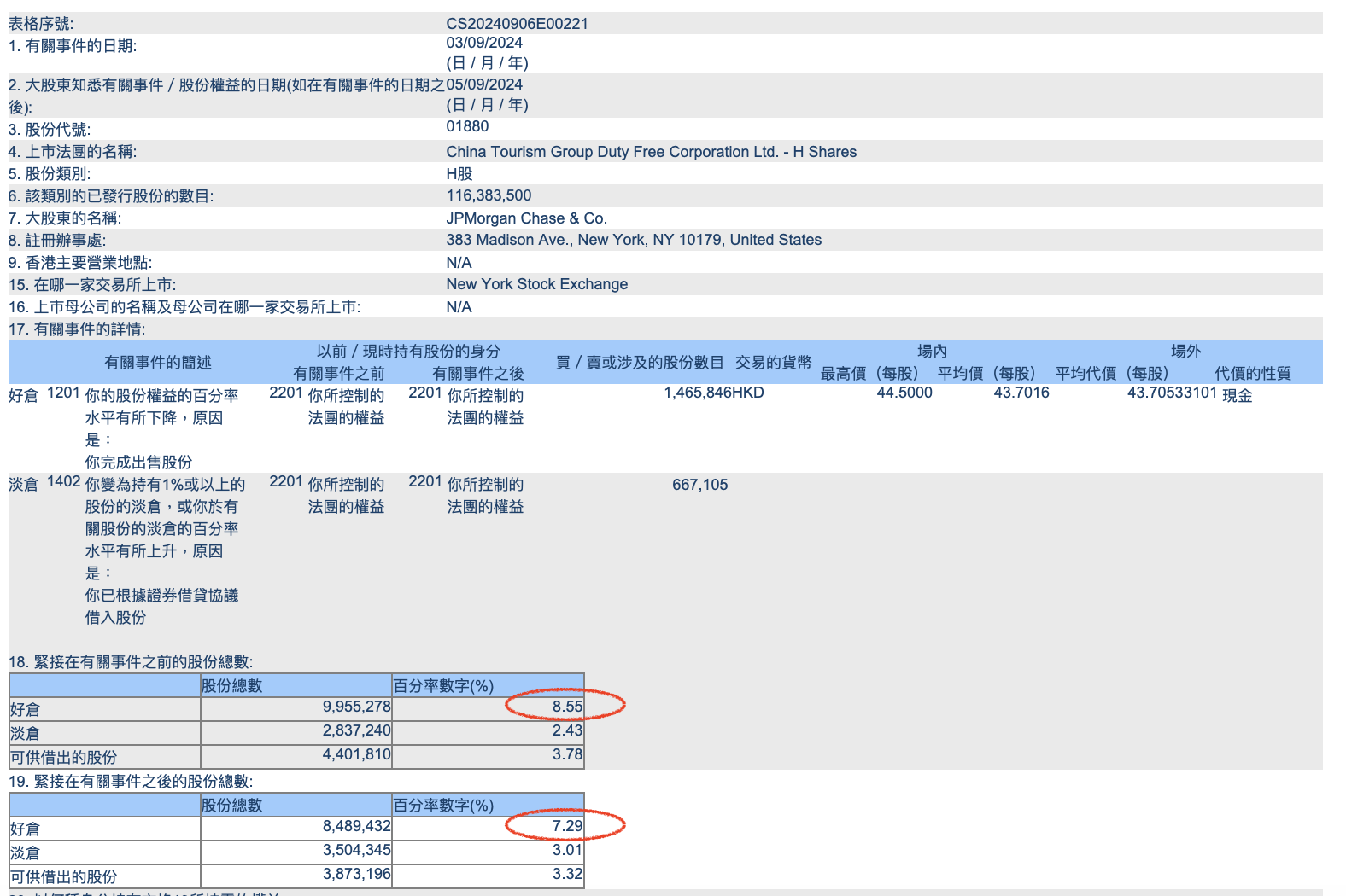 摩根大通在中国中免多头头寸持仓比例降至7.29%