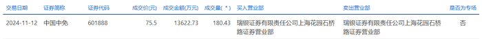 11月12日大宗交易成交180.43万股,成交额1.36亿元,占当日总成交额的5.34%,成交价75.5元,较市场收盘价74.2元溢价1.75%。