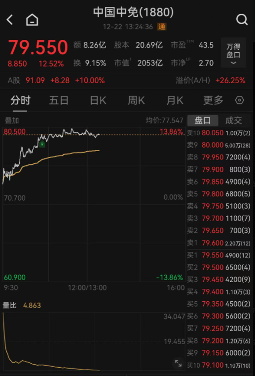 上证报中国证券网讯(记者 何漪)12月22日,海南自贸港板块表现活跃。截至13点24分,中国中免H股报79.55港元/股,上涨12.52%;中国中免A股涨停。