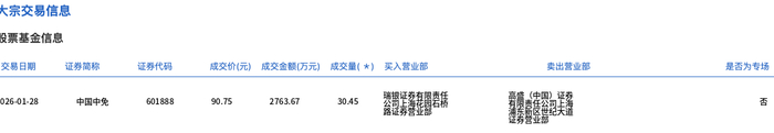 1月28日,中国中免大宗交易成交30.45万股,成交额2763.67万元,占当日总成交额的0.67%,成交价90.75元,较市场收盘价89.84元溢价1.01%。