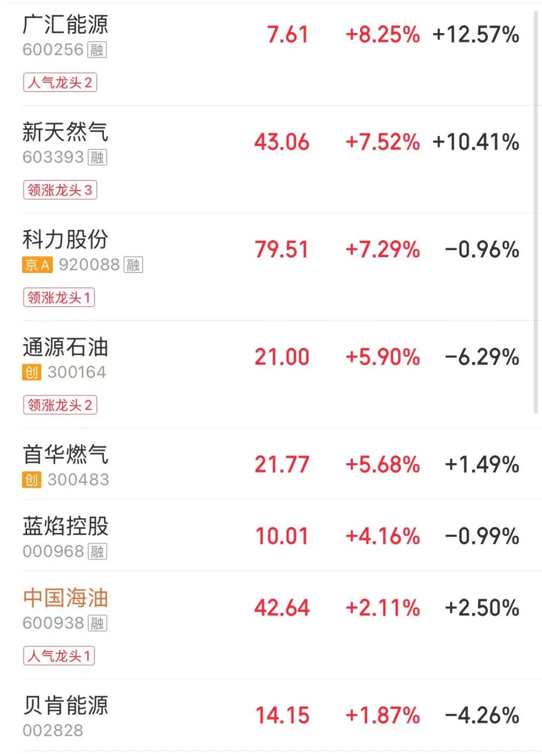 油气股活跃,新天然气、科力股份、广汇能源、首华燃气、通源石油等多股上涨。