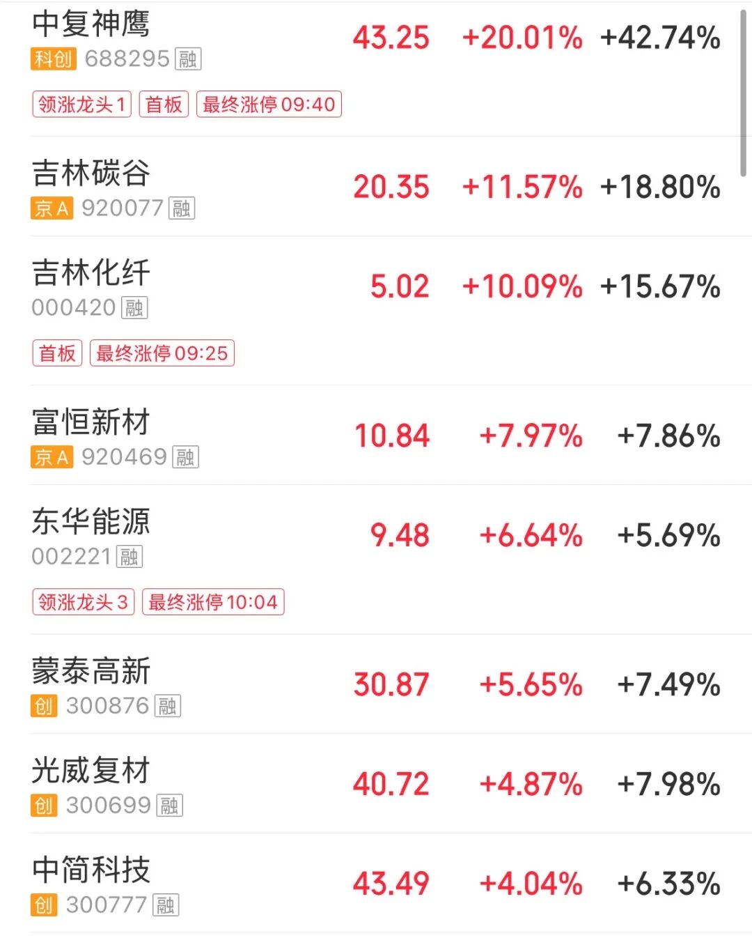 碳纤维概念延续强势,中复神鹰、吉林化纤涨停。