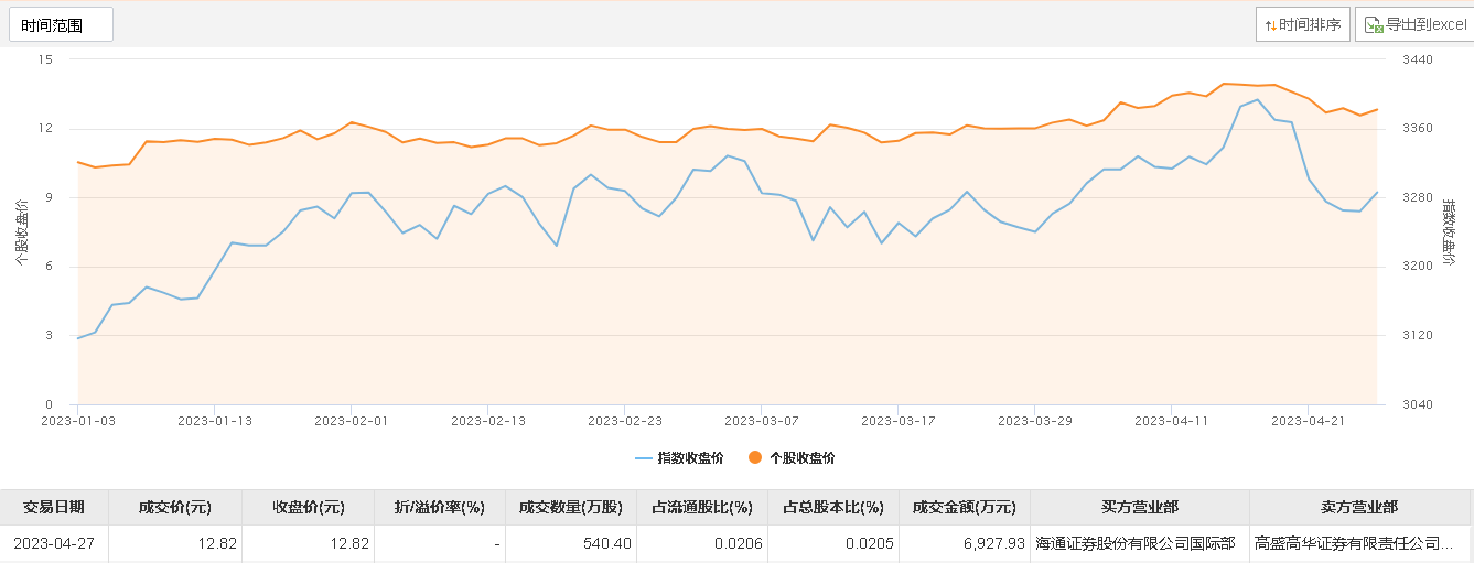 大宗交易成交540.4万股,成交额6927.93万元,占当日总成交额的2.96%,成交价12.82元,较市场收盘价12.82元持平。