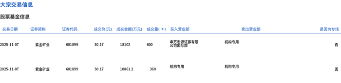 11月7日,紫金矿业大宗交易成交960万股,成交额2.9亿元,占当日总成交额的6.05%,成交价30.17元,较市场收盘价30.17元持平。
