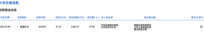 1月9日,紫金矿业大宗交易成交37.08万股,成交额1380.27万元,占当日总成交额的0.13%,成交价37.22元,较市场收盘价37.22元持平。