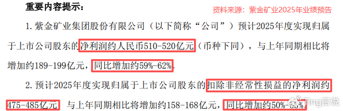 业绩预告显示,紫金矿业2025年全年归母净利润预计将达到510-520亿元,同比增长59%-62%。这一盈利规模在中国矿业企业中位居前列,甚至超过了许多传统能源和资源巨头。