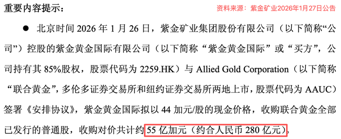 2026年1月26日,紫金矿业发布公告,旗下港股上市公司紫金黄金国际将斥资55亿加元(约合人民币280亿元),全资收购加拿大联合黄金公司,将这家公司在马里、科特迪瓦和埃塞俄比亚的三座大型金矿尽数收入囊中。