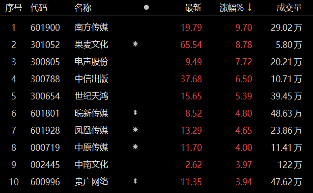 上证报中国证券网讯 5月18日,传媒板块震荡反弹,截至13:57,南方传媒触及涨停,果麦文化、电声股份、世纪天鸿等涨超5%。