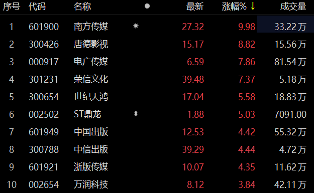 上证报中国证券网讯 6月1日,传媒板块表现活跃。截至9:48,南方传媒3连板,唐德影视、电广传媒、荣信文化等跟涨。