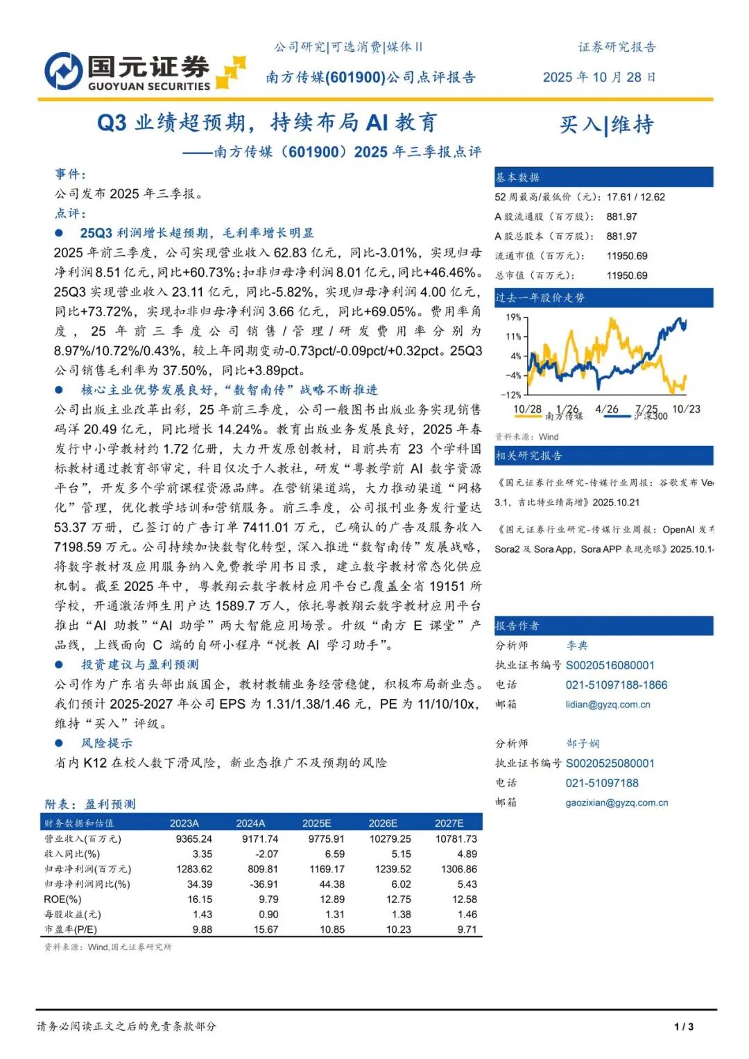 本报告摘自国元证券2025年10月28日已发布的《Q3业绩超预期,持续布局AI教育——南方传媒(601900)2025年三季报点评》,具体报告及分析内容请详见报告。若因对报告的摘编等产生歧义,应以报告发布当日的完整内容为准。
