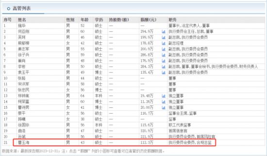 据东方财富网信息显示,去年5月上任后曹玉海获得的薪酬为112.3万元。