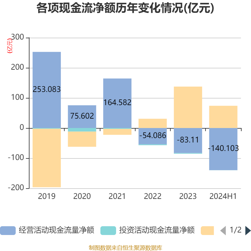 2024年上半年,公司经营活动现金流净额为-140.10亿元,同比减少195.37亿元;筹资活动现金流净额73.91亿元,同比增加29.19亿元;投资活动现金流净额-4798.09万元,上年同期为-7272.28万元。