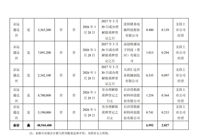此次,京运通达兴合计将48,944,400股质押给了7家供应商,占其所持股份的6.992%,占公司总股本的2.027%。