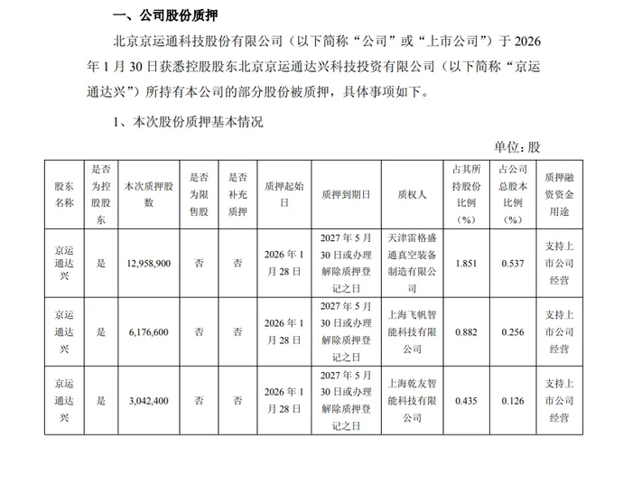 1月30日,京运通发布关于控股股东股份质押的公告。公告显示,公司控股股东北京京运通达兴科技投资有限公司(简称“京运通达兴”)将所持股份质押给了7家供应商,详情如下: