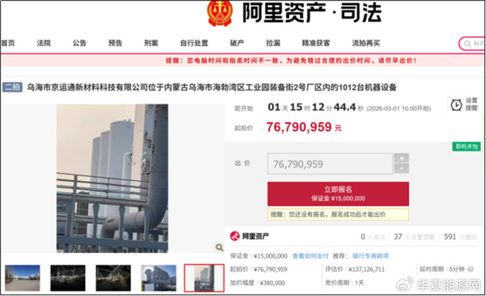 华夏能源网注意到,2月1日,在阿里拍卖平台上,乌海市京运通新材料科技有限公司的两处资产被挂牌拍卖。其中,60台干式变压器以837.47万元价格成交;1012台机器设备则流拍,之后起拍价由9598.86万元降至7679.09万元,将于3月1日开启第二轮拍卖。