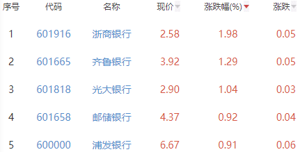其中,浙商银行、齐鲁银行、光大银行、邮储银行和浦发银行位列板块涨幅前五位,涨幅分别为1.98%、1.29%、1.04%、0.92%和0.91%。