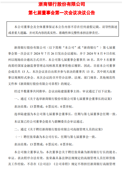 于2024年8月9日召开第七届董事会第一次会议,会议选举陆建强为第七届董事会董事长,委任张荣森为该行行长,以上任期与第七届董事会一致。