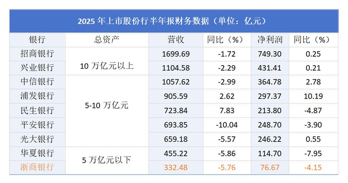 截至2025年6月末,浙商银行总资产3.3万亿元、营业收入332.48亿元、净利润76.67亿元,三大指标排名均排在最后一位。