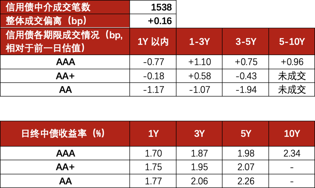 二级方面,信用债成交情况热情略减,成交1538笔,位于历史61%分位,低估值0.15bp成交。1Y内期限买盘类型主要为基金、理财;1-3Y好名字买盘类型相对丰富;3Y以上好名字信用债主要买盘类型为银行、基金、券商资管。1Y内信用债成交475笔,位于历史36%分位,情绪较昨日适度好转,中位数低估值0.50bp左右成交,收益率中枢为1.73%。1-3Y信用债成交627笔,情绪落回中位,位于历史63%分位,中位数低估值0.05bp左右成交,收益率中枢维持1.98%。3-5Y信用债成交350笔,情绪略微高于昨日,位于历史88%分位,中位数高估值0.38bp成交。5Y以上信用债成交77笔,位于历史60%分位,情绪少许弱于昨日,中位数高估值0.83bp成交。