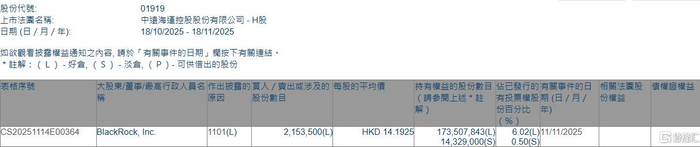 格隆汇11月18日丨根据联交所最新权益披露资料显示,2025年11月11日,中远海控(01919.HK)获BlackRock, Inc.在场内以每股均价14.1925港元增持好仓215.35万股,涉资约3056.35万港元。