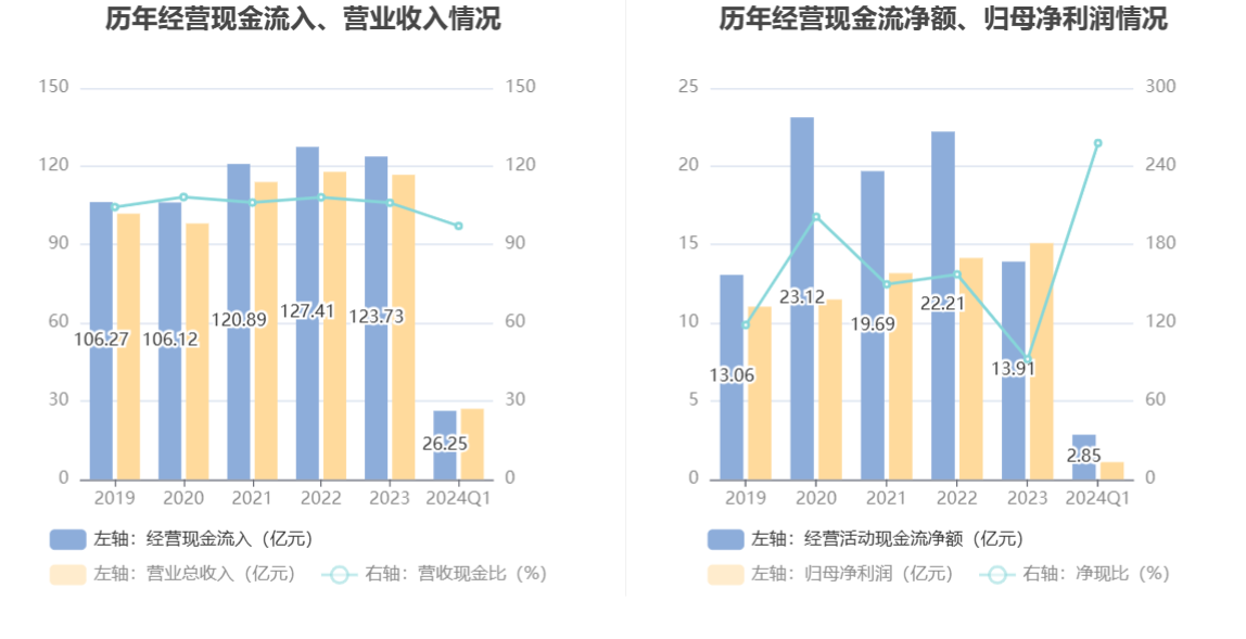 2024年第一季度,公司营业收入现金比为97.10%,净现比为257.76%。