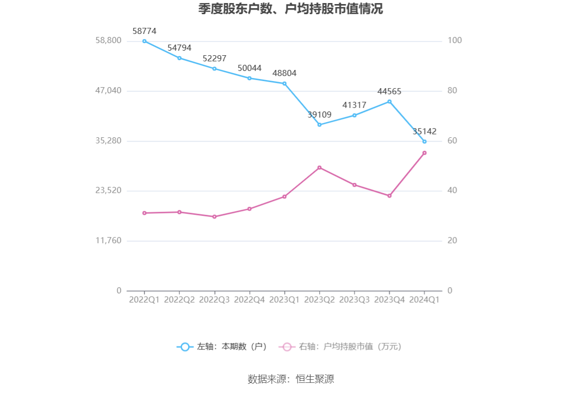 筹码集中度方面,截至2024年一季度末,公司股东总户数为3.51万户,较上年末下降了9423户,降幅21.14%;户均持股市值由上年末的38.10万元上升至55.27万元,增幅为45.07%。