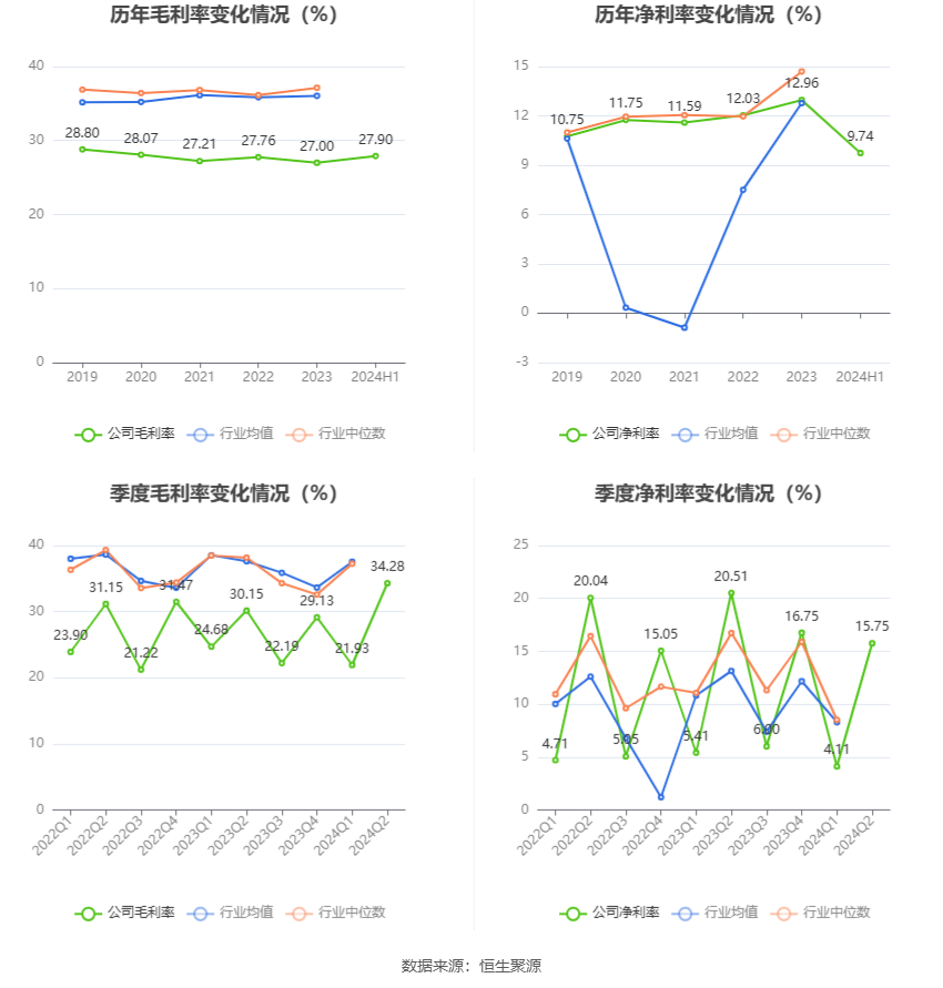 2024年上半年,公司毛利率为27.90%,同比上升0.42个百分点;净利率为9.74%,较上年同期下降3.41个百分点。从单季度指标来看,2024年第二季度公司毛利率为34.28%,同比上升4.13个百分点,环比上升12.35个百分点;净利率为15.75%,较上年同期下降4.76个百分点,较上一季度上升11.64个百分点。