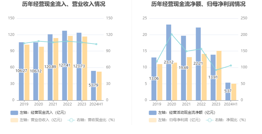 2024年上半年,公司营业收入现金比为102.80%,净现比为106.12%。