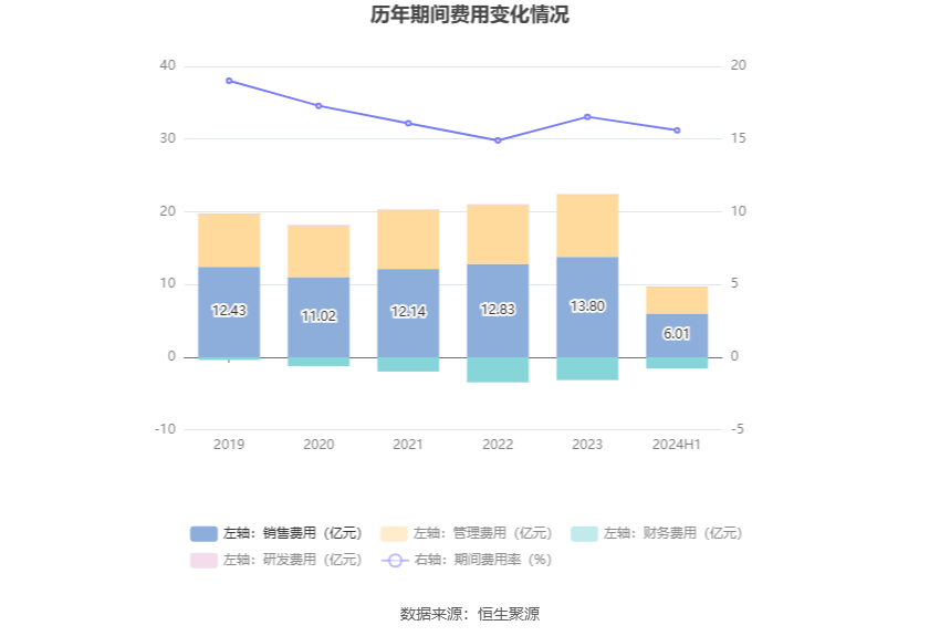 2024年上半年,公司期间费用为8.16亿元,较上年同期增加1606.00万元;期间费用率为15.60%,较上年同期上升1.08个百分点。其中,销售费用同比增长1.52%,管理费用同比增长3.21%,研发费用同比增长43.58%,财务费用由去年同期的-1.49亿元变为-1.56亿元。