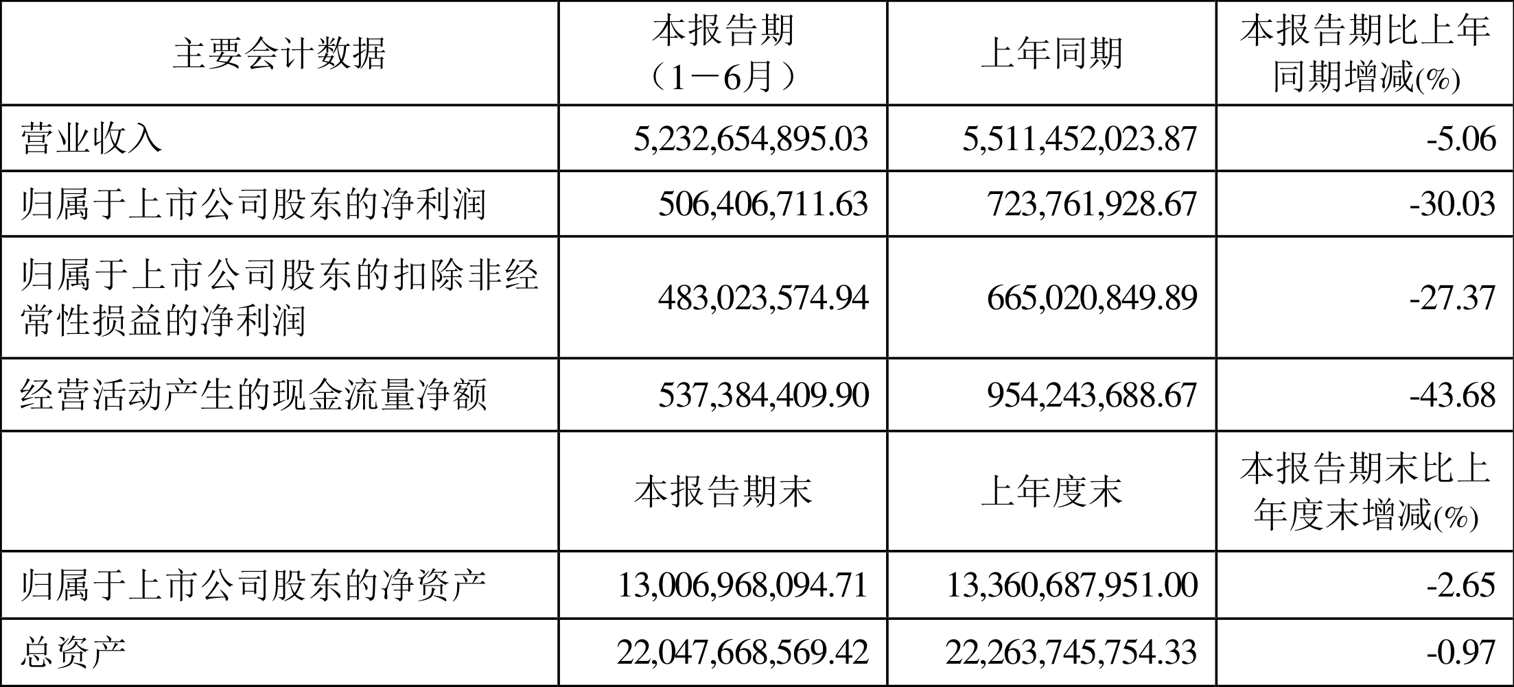 2024年上半年,公司经营活动现金流净额为5.37亿元,同比下降43.68%;筹资活动现金流净额-8.84亿元,同比增加2.79亿元;投资活动现金流净额-33.01亿元,上年同期为-8496.01万元。
