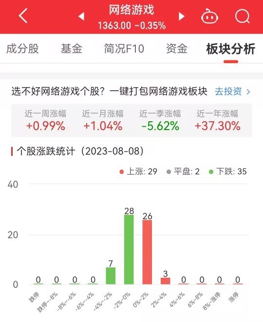 中国经济网北京8月8日讯今日,网络游戏板块整体跌幅0.35%,其中29只股票上涨,2只股票平盘,35只股票下跌。