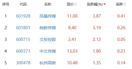 其中,凤凰传媒、皖新传媒、文投控股、中文传媒、杭州高新位列板块涨幅前五位,涨幅分别为3.87%、3.19%、2.12%、1.80%、1.35%。