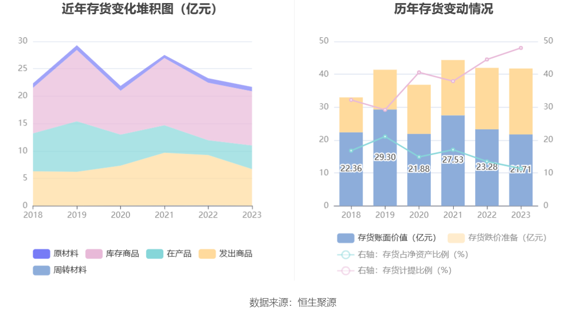 从存货变动来看,截至2023年年末,公司存货账面价值为21.71亿元,占净资产的11.34%,较上年末减少1.58亿元。其中,存货跌价准备为20.05亿元,计提比例为48.02%。