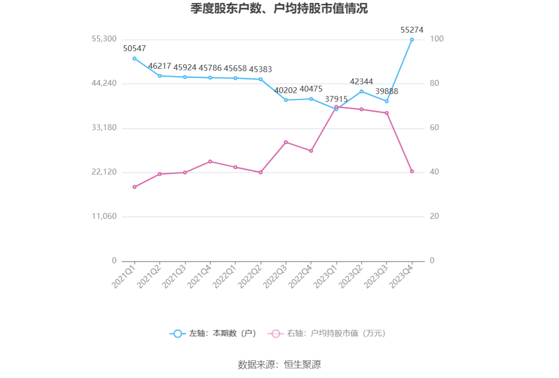 筹码集中度方面,截至2023年年末,公司股东总户数为5.53万户,较三季度末增长了1.54万户,增幅38.57%;户均持股市值由三季度末的66.86万元下降至40.56万元,降幅为39.34%。