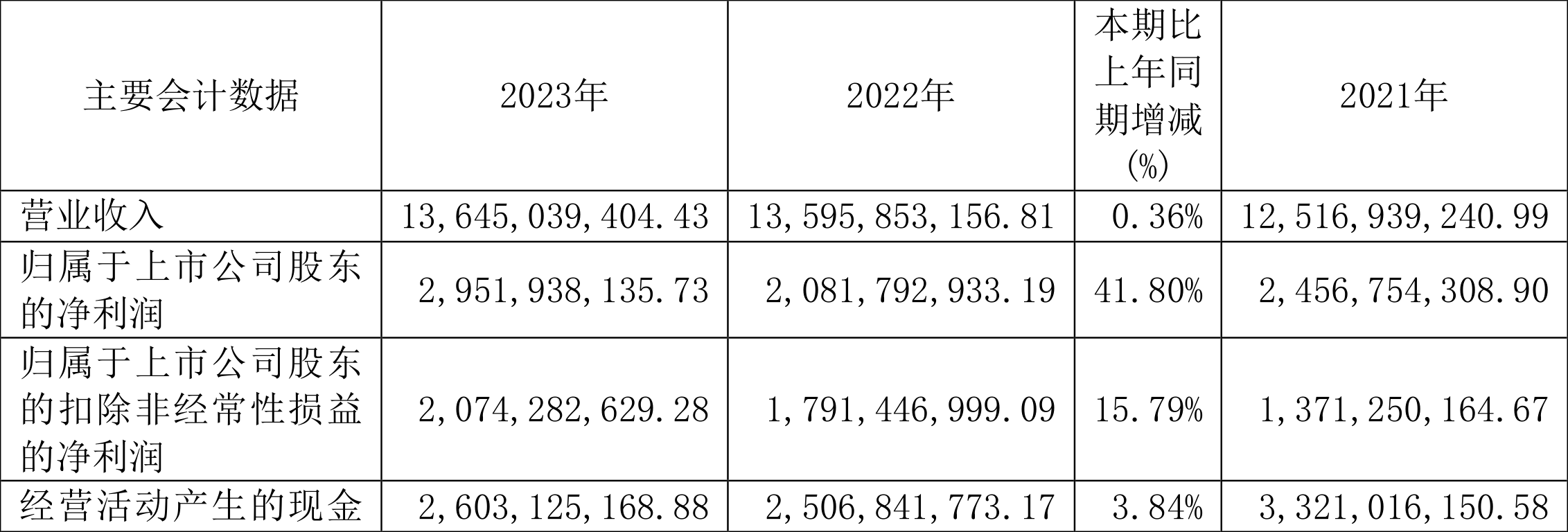 2023年,公司经营活动现金流净额为26.03亿元,同比增长3.84%;筹资活动现金流净额-12.26亿元,同比增加2465.58万元;投资活动现金流净额-46.89亿元,上年同期为12.42亿元。