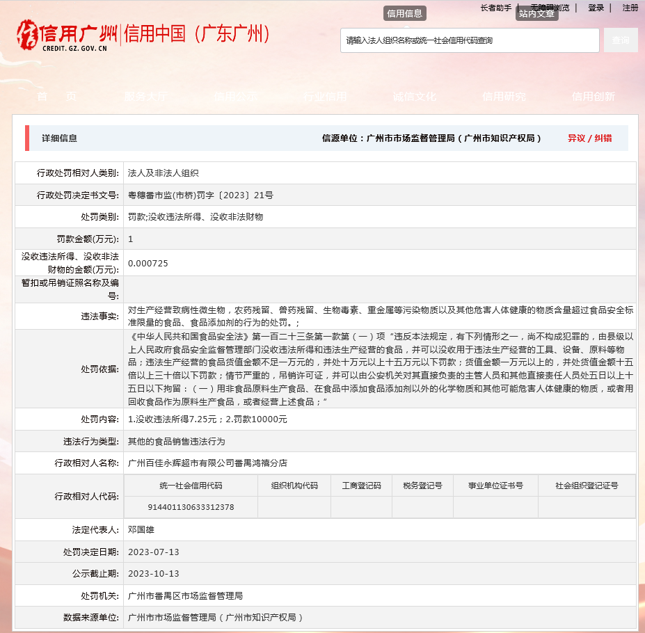 中国质量新闻网讯 近日从信用中国(广东广州)网站获悉,