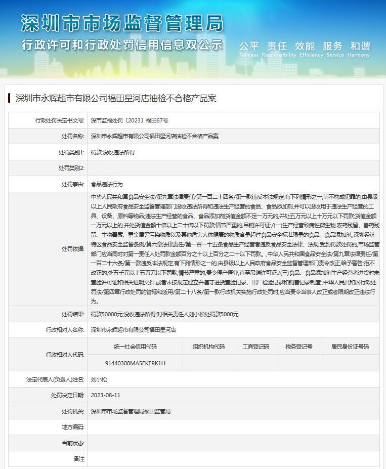 深圳市永辉超市有限公司福田星河店抽检不合格产品案