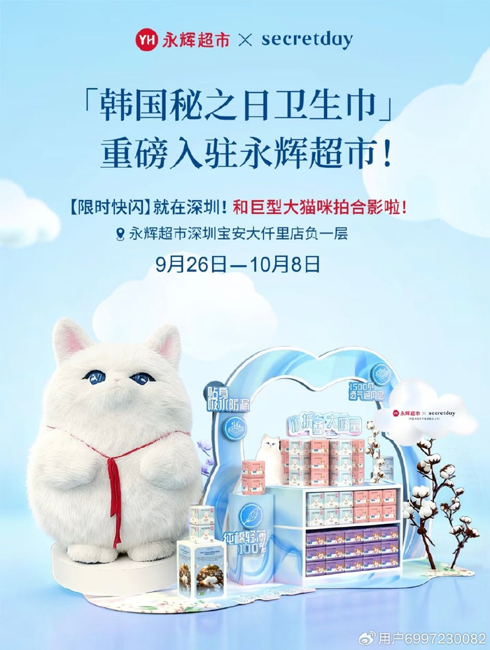 签约当天,secretday已经在广州永辉丽影店正式首发,并于同日下午在深圳宝安大仟里启动首场中国快闪活动,活动将持续到10月8日,参与互动打卡可获得免费礼品;后续还将复制韩国圣水洞快闪模式,在国内至少落地2家大型快闪店,还原 “年轻化、场景化” 的品牌体验。
