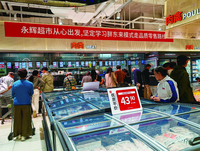 永辉超市“胖改”的实际成效如何?10月14日晚上8时,记者探访了位于南京建邺区的永辉超市河西天街店。“商品结构达到胖东来的80%以上”“坚定学习胖东来模式走品质零售路线”……店内挂着不少红底白字的标语,凸显出浓浓的“胖改”氛围。店内还设有胖东来品牌专区,精酿啤酒、果汁、食用油等DL网红产品整齐摆放,但部分产品需要永辉超市会员才可购买,并设定了购买上限。