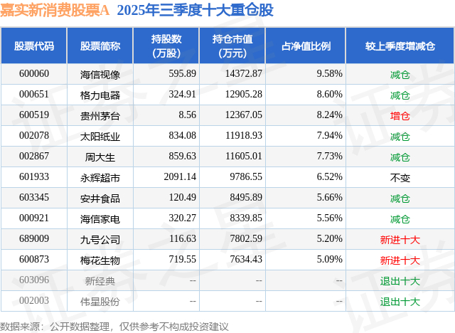 嘉实新消费股票A的前十大重仓股如下: