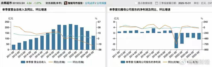 分季度来看,第三季度的经营表现也有压力,2025年第三季度,永辉超市实现营收124.86亿元,同比下降25.55%,归母净利润亏损4.69亿元,同比下降32.86%;扣非归母净利润亏损约7.00亿元,同比下降1.16%。