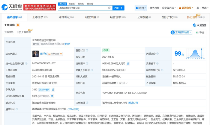 天眼查App显示,永辉超市股份有限公司成立于2001年4月,法定代表人为张轩松,注册资本约90.8亿人民币,经营范围包括网上贸易代理、互联网零售、信息服务业务等,由广东骏才国际商贸有限公司、张轩松、张轩宁等共同持股。对外投资信息显示,该公司对外投资80余家企业,其中60余家处于存续状态,包括永辉云创科技有限公司、四川永辉超市有限公司等,其他10余家企业已注销。历史被执行人信息显示,该公司近一年已被多次执行。