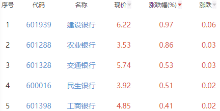 其中,建设银行、农业银行、交通银行、民生银行和工商银行位列板块涨幅前五位,涨幅分别为0.97%、0.86%、0.53%、0.51%和0.41%。