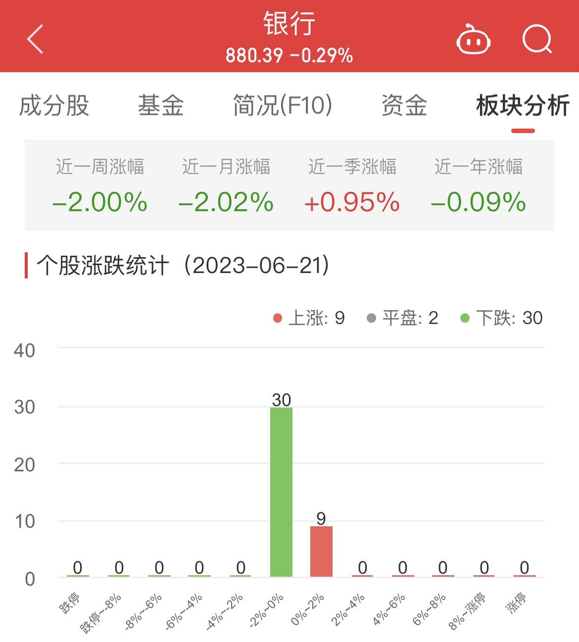 中国经济网北京6月21日讯今日,银行板块整体涨幅-0.29%,其中9只股票上涨,2只股票平盘,30只股票下跌。