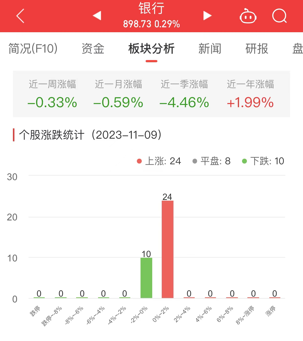 中国经济网北京11月9日讯今日,银行板块整体涨幅0.29%,其中24只股票上涨,8只股票平盘,10只股票下跌。