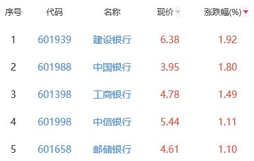 其中,建设银行、中国银行、工商银行、中信银行、邮储银行位列板块涨幅前五位,涨幅分别为1.92%、1.80%、1.49%、1.11%、1.10%。