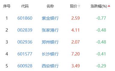 紫金银行、张家港行、郑州银行、长沙银行、西安银行位列涨幅榜后五位,涨幅分别为-0.77%、-0.48%、-0.48%、-0.41%、-0.29%。
