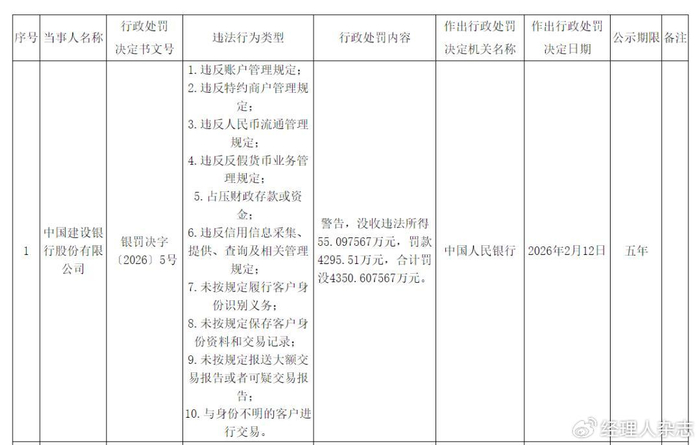 2026年2月12日,中国人民银行集中公布一批行政处罚决定,针对中国建设银行股份有限公司(以下简称“建设银行”)存在的多项违法违规行为,依法作出严厉处罚,同时对22名相关责任人同步追责,合计罚没金额高达4350.607567万元,彰显了监管部门强化金融合规监管、严打违法违规行为、防范金融风险的坚定决心。