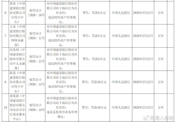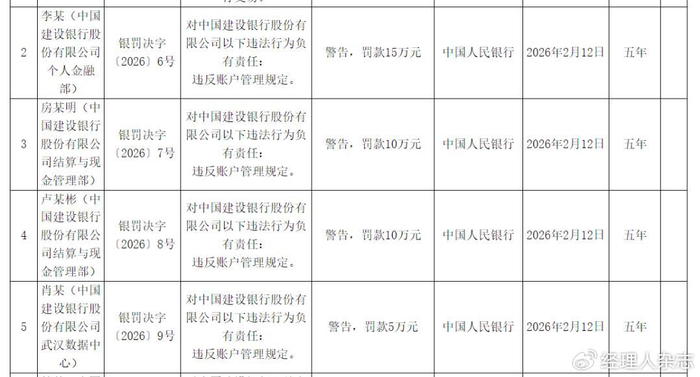 据悉,此次对建设银行的处罚决定书编号为银罚决字〔2026〕5号,