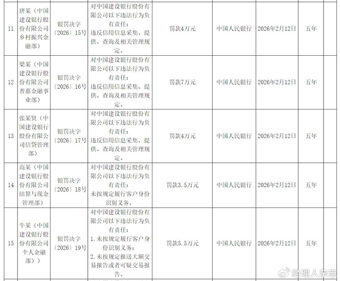 此次处罚并非仅针对机构,而是严格实行“机构+个人”双罚制,将责任落实到具体岗位、具体人员,22名相关责任人因对建设银行相关违法违规行为负有直接责任,被分别给予警告、罚款处罚,罚款金额从1万元至15万元不等,责任追究期限均为五年。